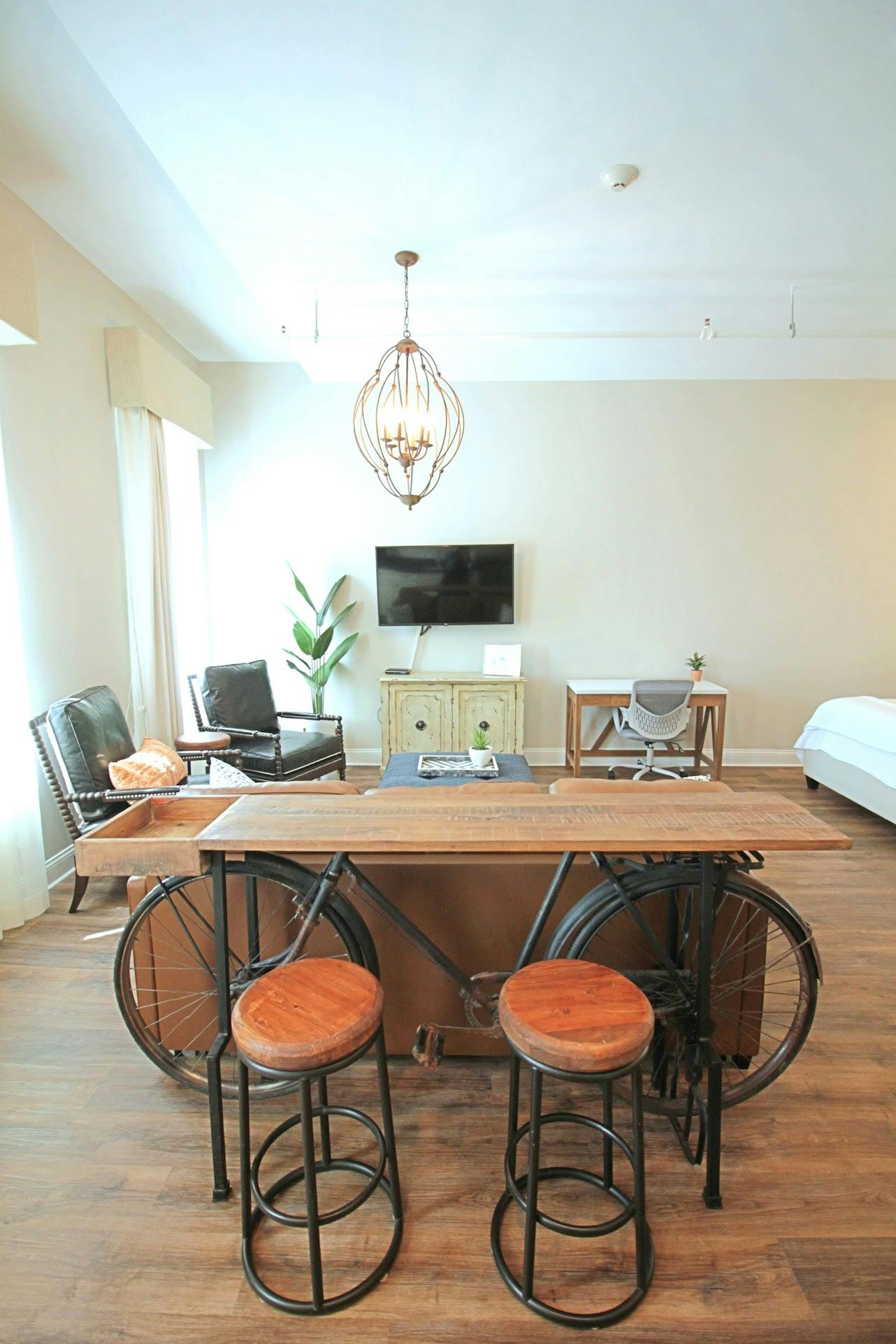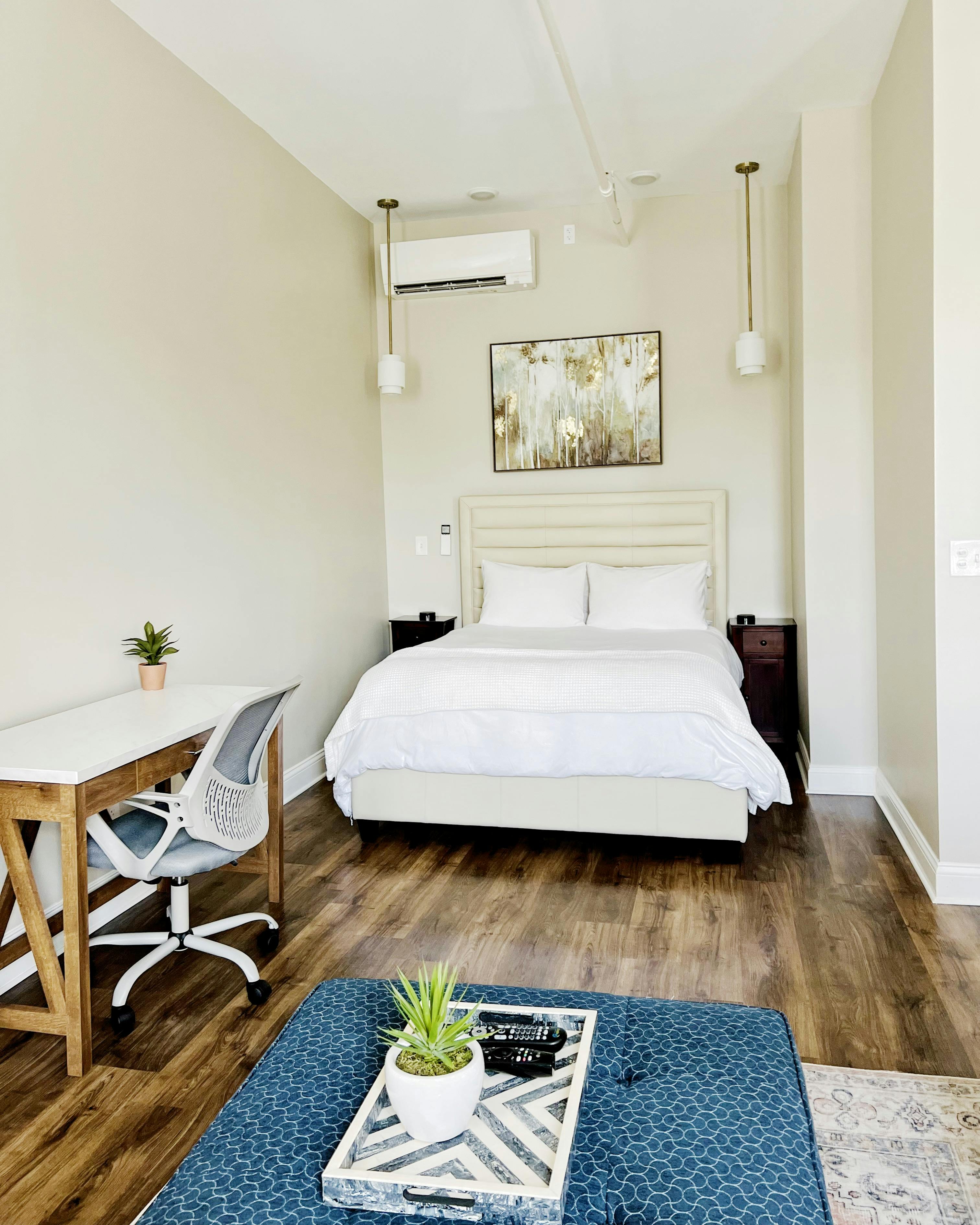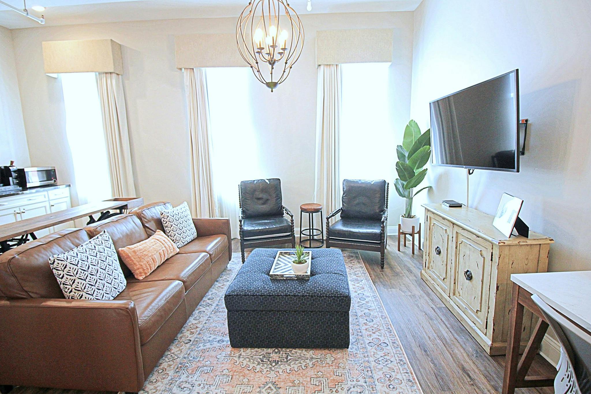 This bright and airy suite offers plenty of natural light and a lovely view of the city. It is located directly above Bishop’s Quarter, a popular local restaurant with a lively atmosphere.